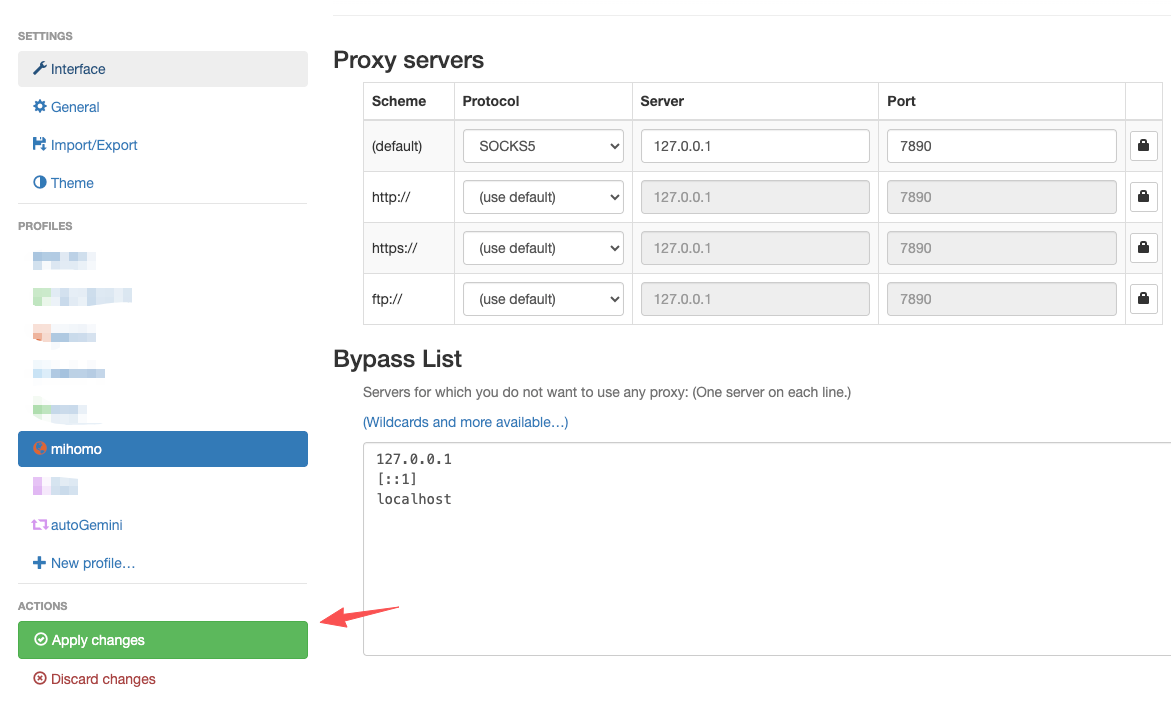 如果希望在整个电脑级别使用代理,可以将mihomo设置为系统代理,不同操作系统设置系统代理的方式不一样,这里以mac为例。