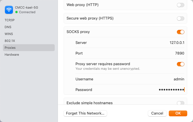如果你的服务端跟我一样设置了密码,那在输入代理的时候,还需要点击代理地址右边的小锁头图标,输入账号密码才能使用。